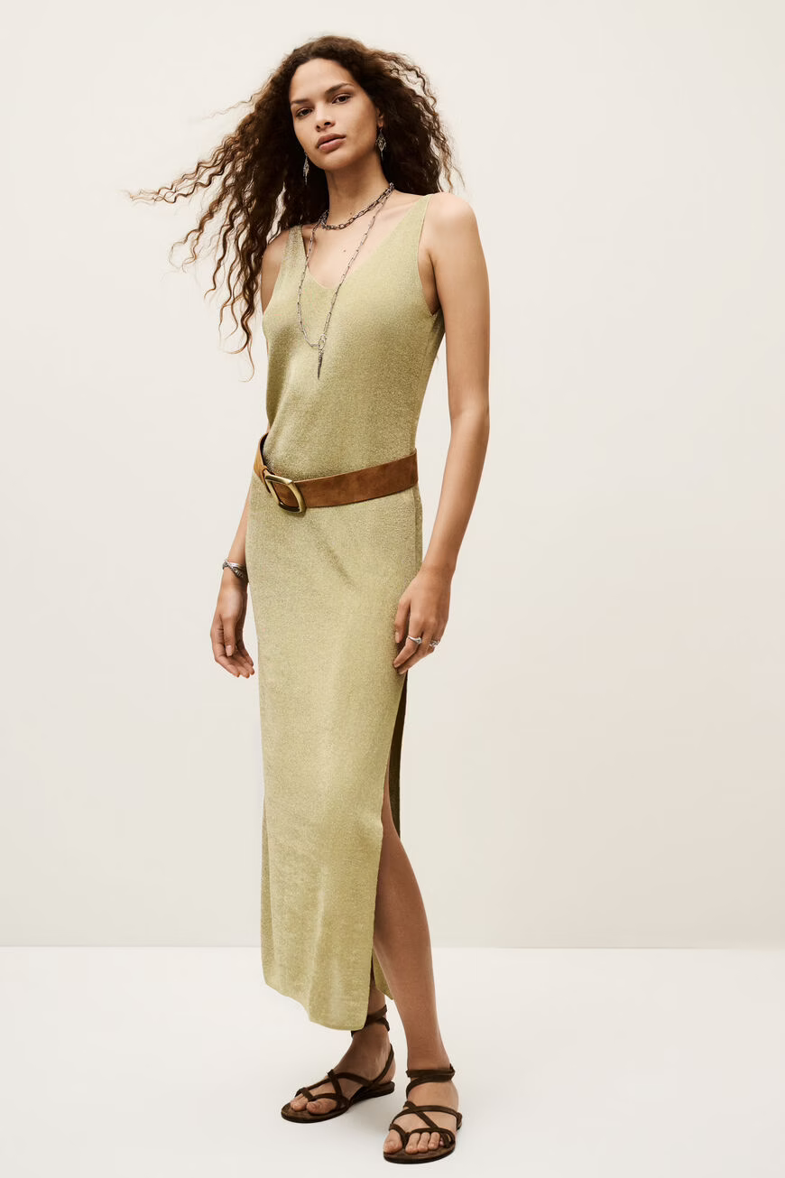 בגזרה משוחררת, עם מפתח וי, גב פתוח, כתפיות דקות ושסע צדדי. עשויה מבד במראה מטאלי.