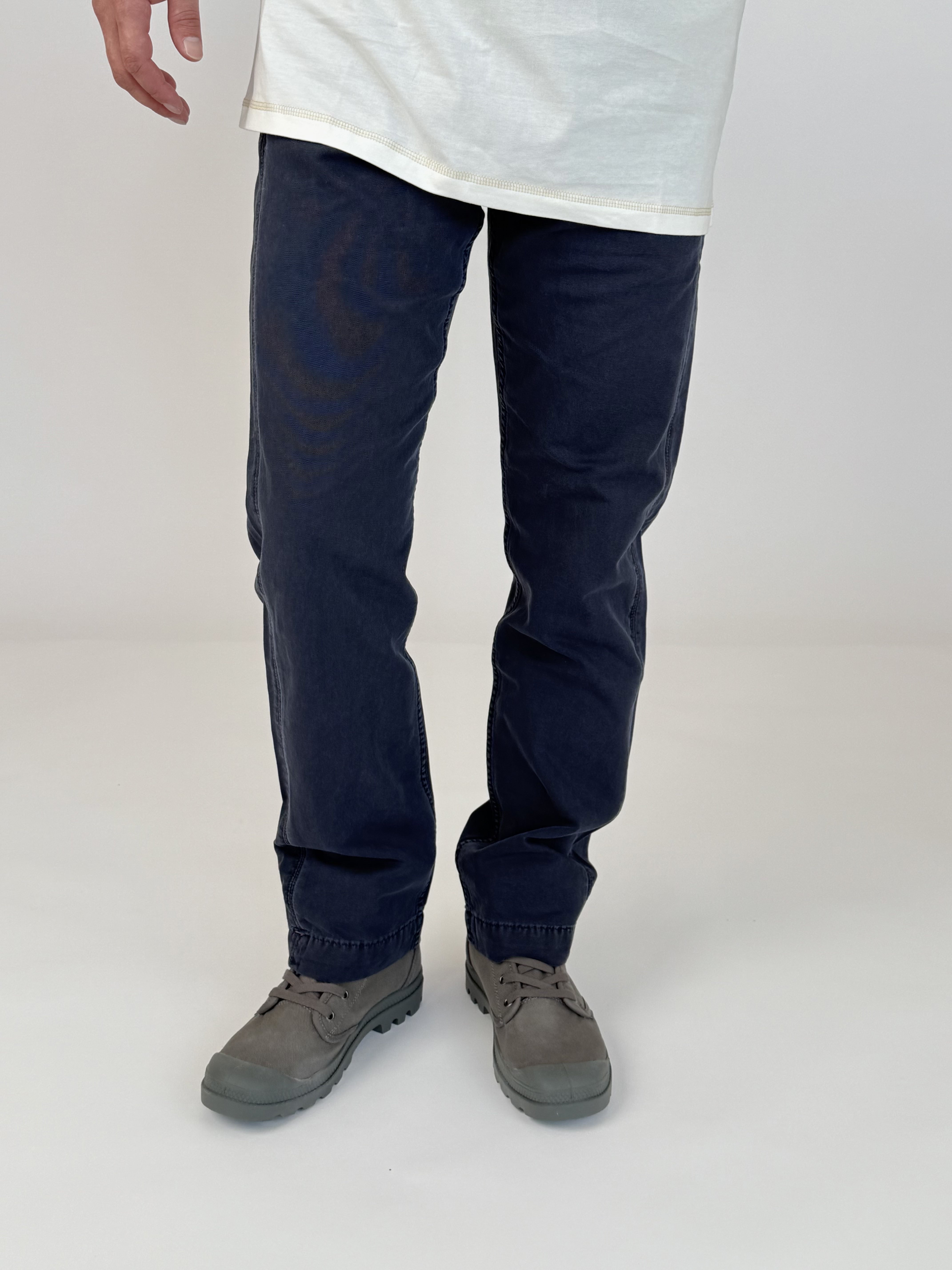 מכנסיים ארוכים לגברים מבית המותג מינוס 1. בגזרה ישרה עשויים קנבס כותנה עמיד בגוון סנד בהיר.
