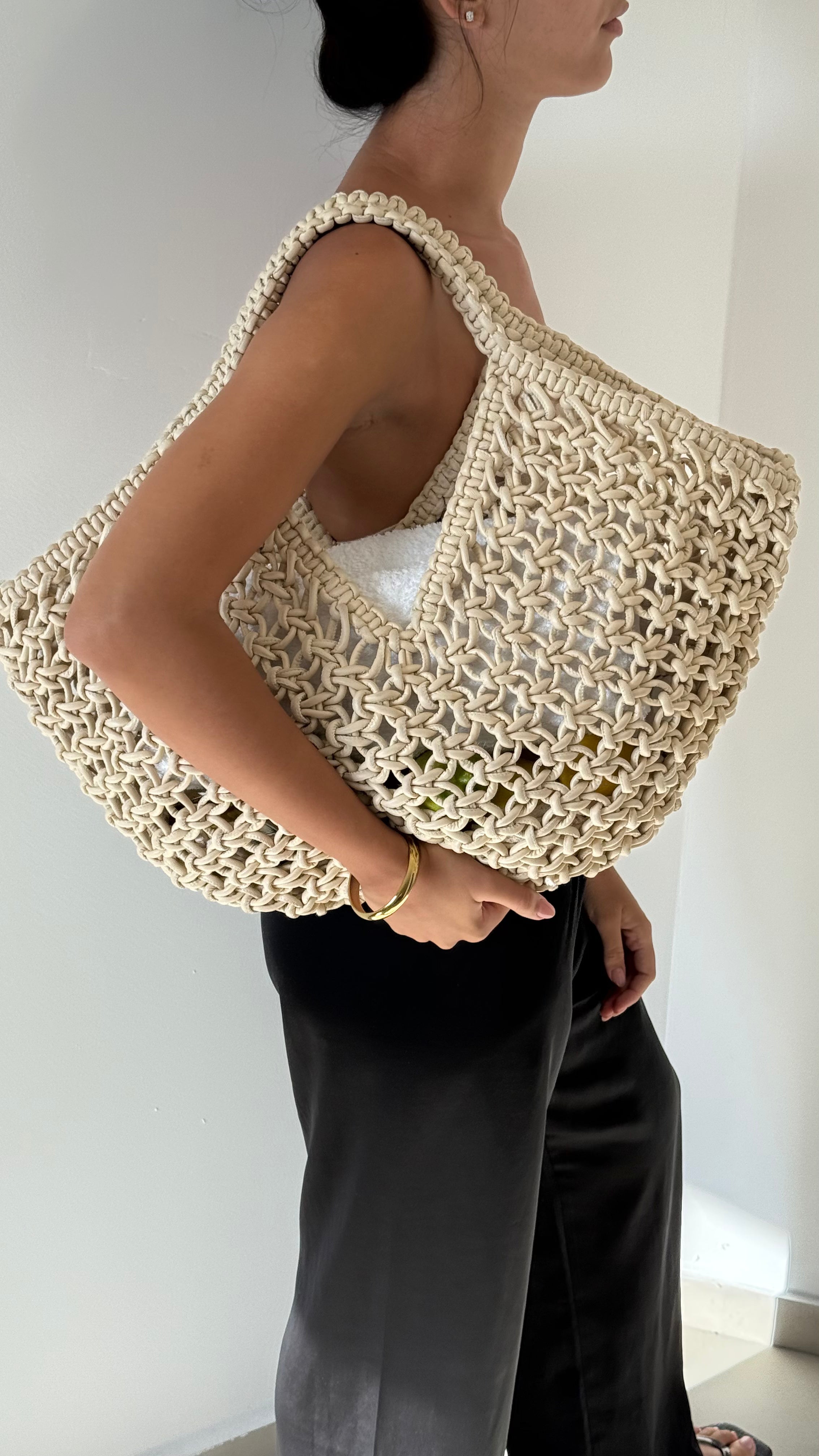 תיק צד לנשים קרושה גדול, סרוג בעבודת יד מחוטי עור.