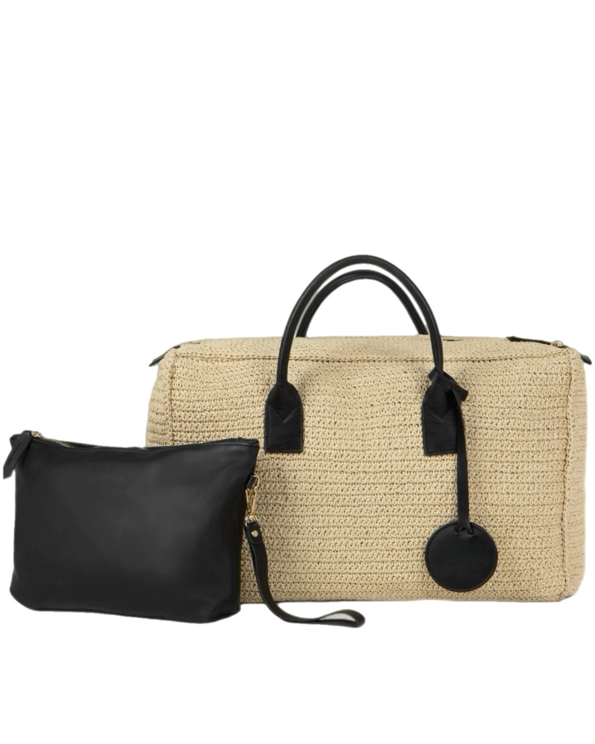 תיק נשיאה מלבני אלגנטי, בעבודת יד מסריגת רפיה כפולה בשילוב עור עגל שחור.
