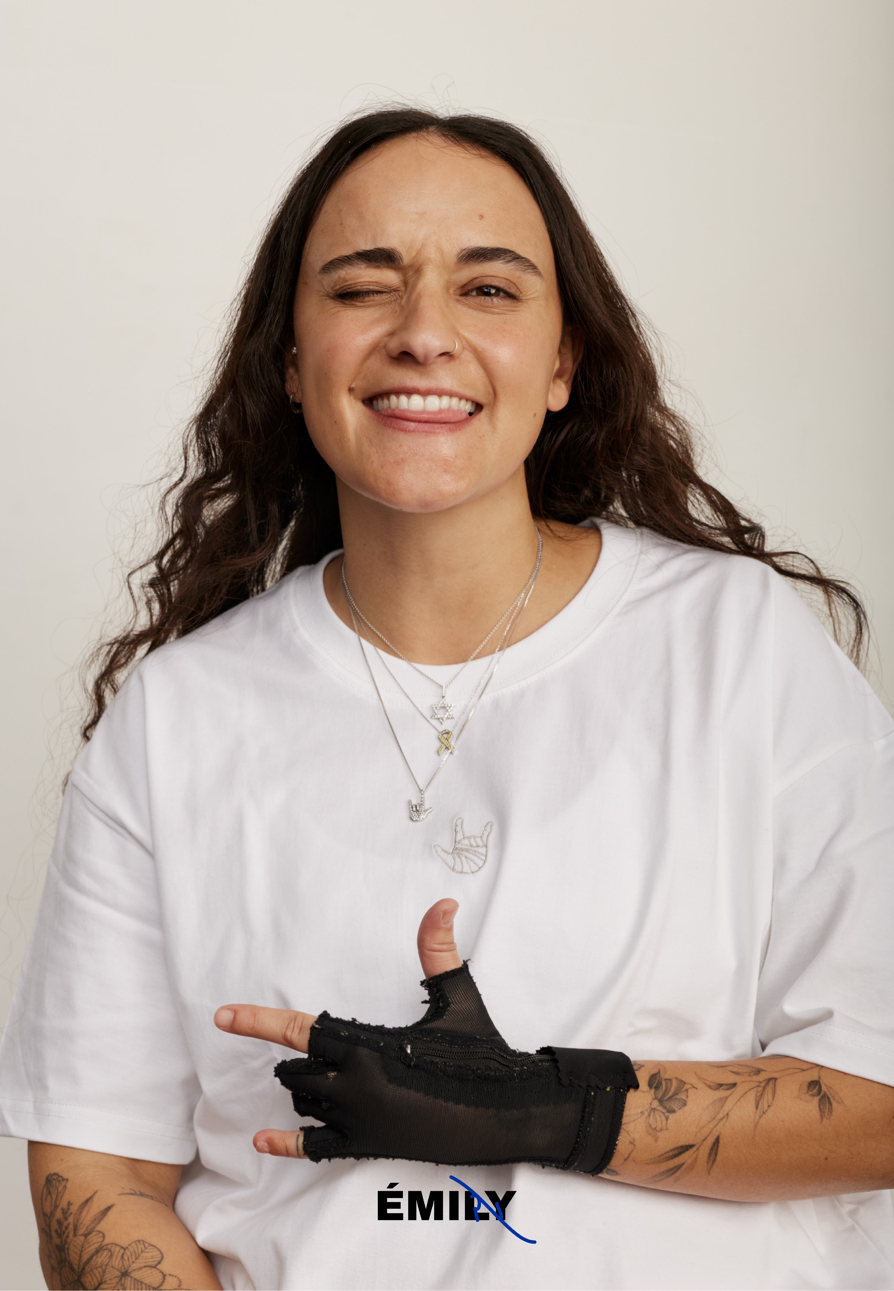 הקולקציה של אמילי נולדה מתוך כוח העל שלה להתמסר לשברים, להתגאות בהם, לתת להם לחזק אותה, ומתוך האמונה כי אי אפשר לשבור את מי שתמיד ירכיב את עצמו מחדש. התיפורים הגלויים, האלמנטים המפורקים, הקצוות הפרומים; כולם מונחים עם כבוד וכוונה, כולם עדינים ומחוספסים, כולם אמילי.