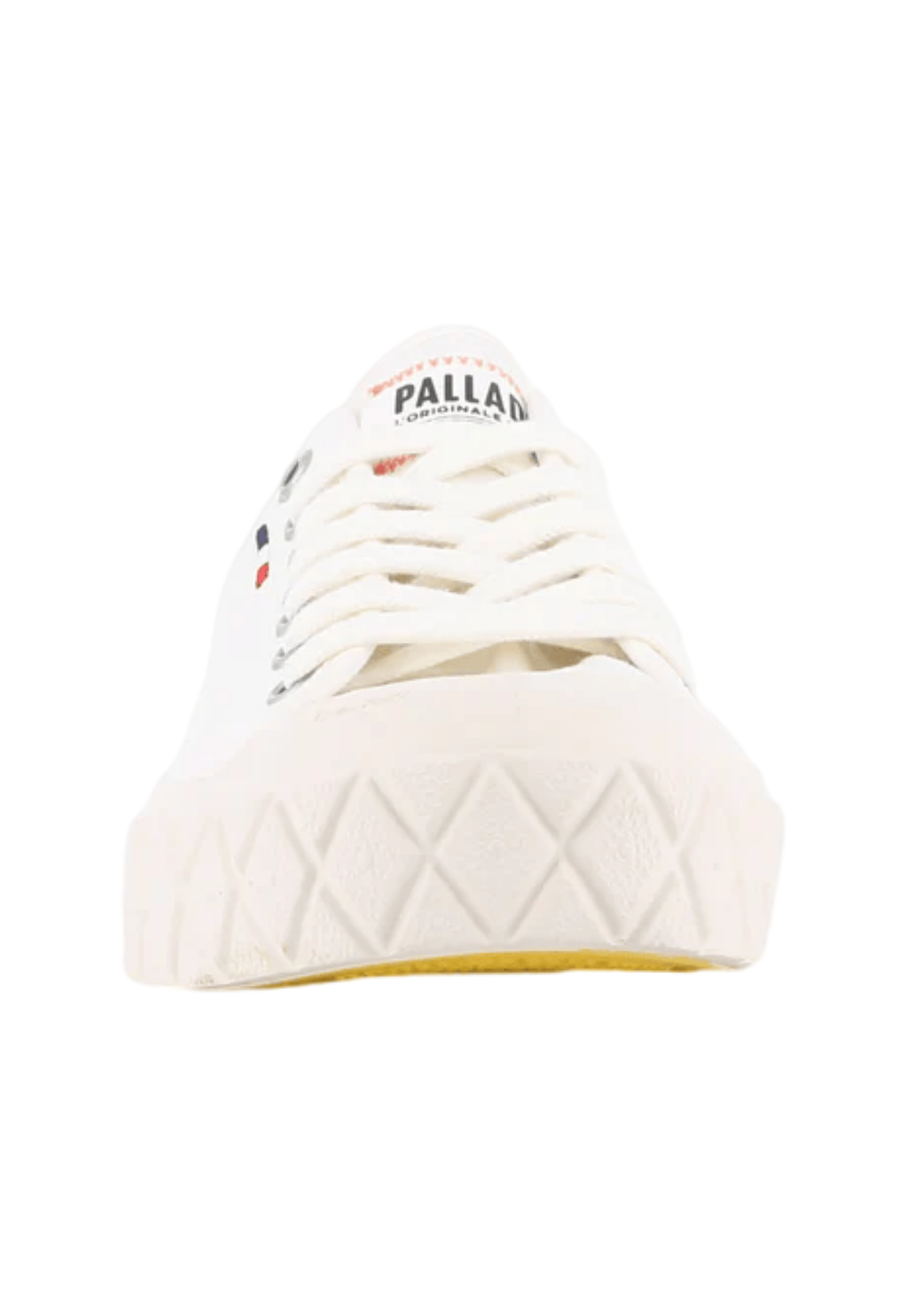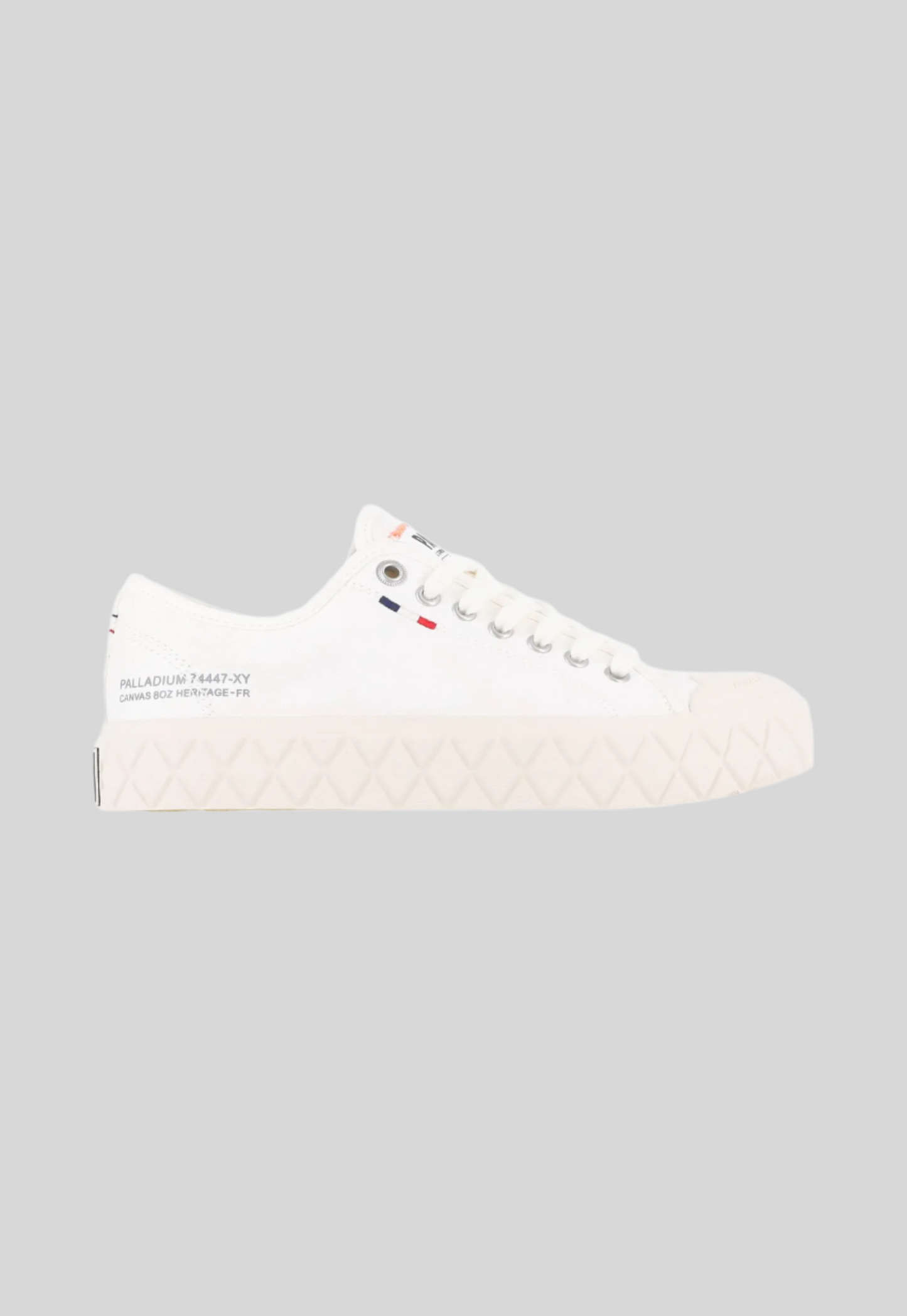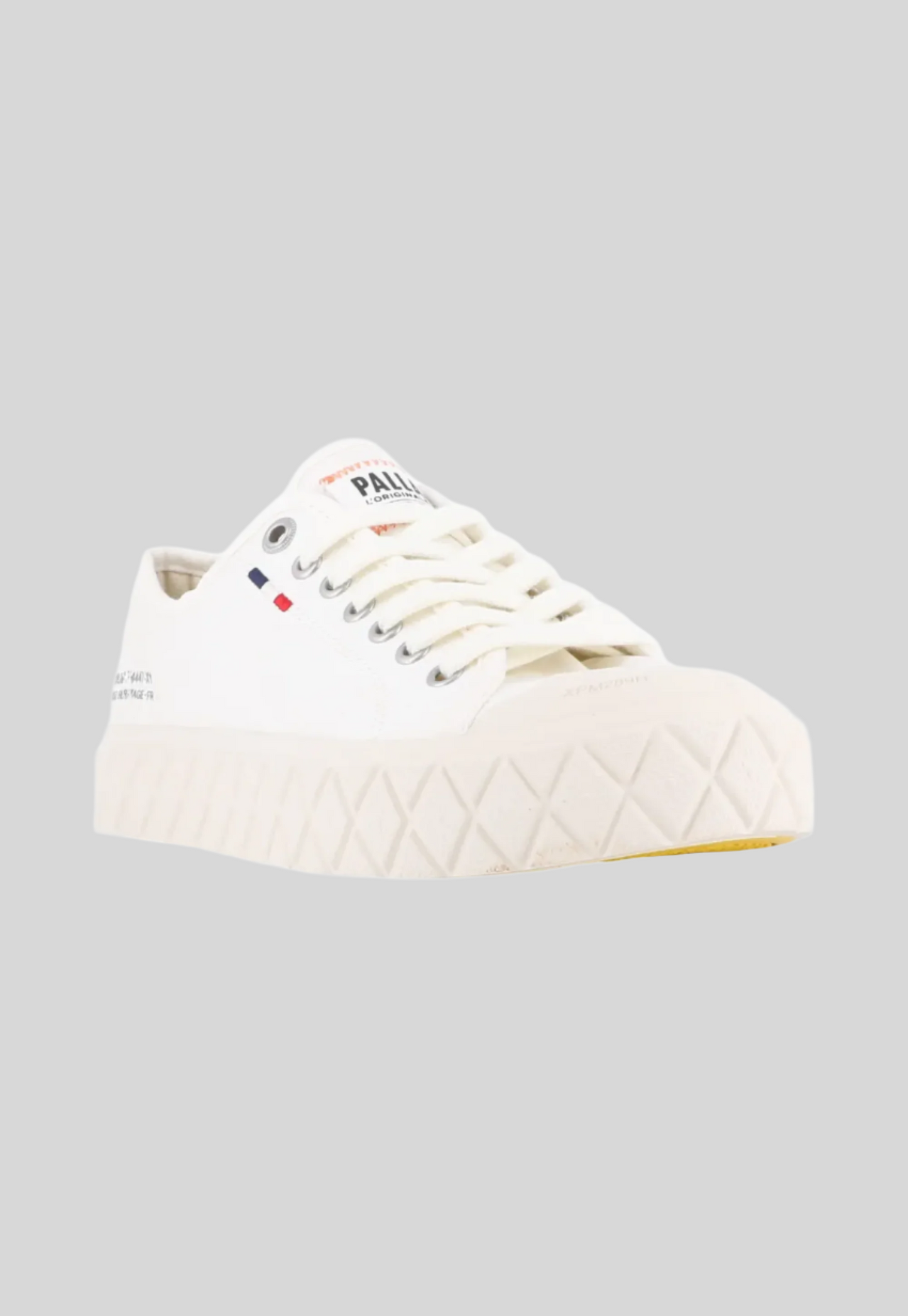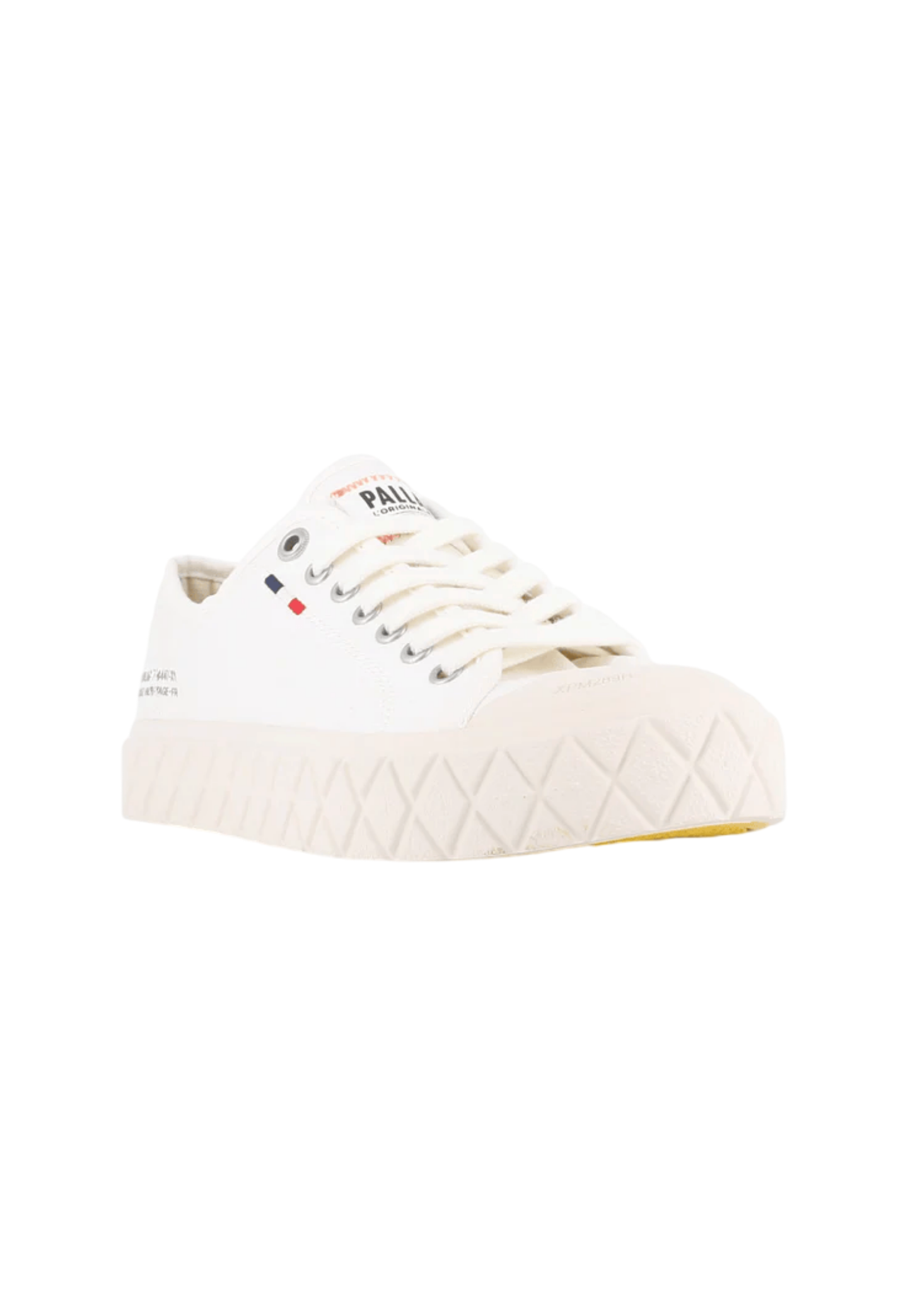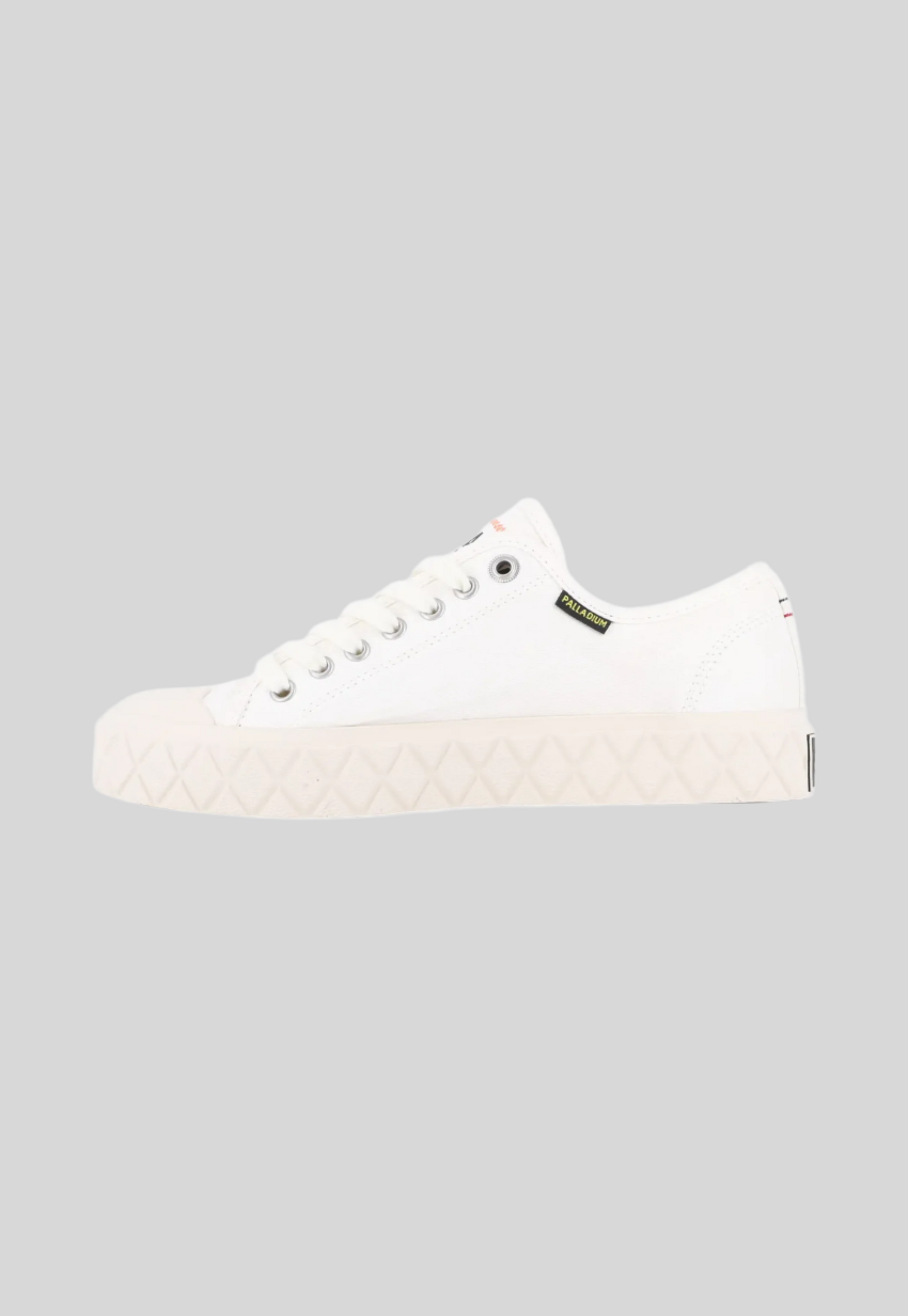 סניקרס יוניסקס מבית המותג פלדיום, בגזרה נמוכה. החלק העליון עשוי קנבס עם קשירת שרוכים. בשילוב סוליית גומי עבה, גבוהה וגמישה. בשילוב הטבעת לוגו המותג בצד הנעל.