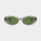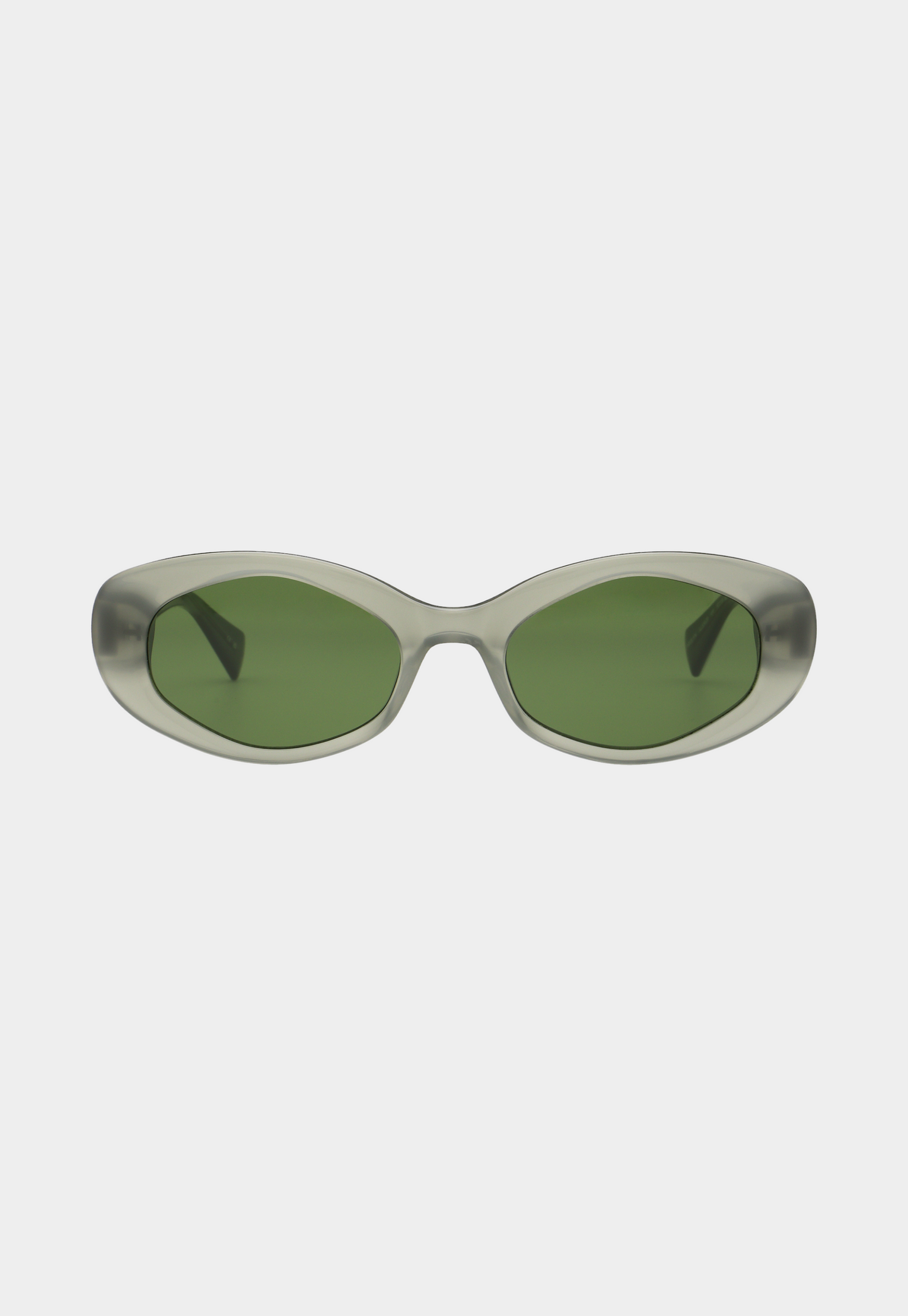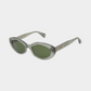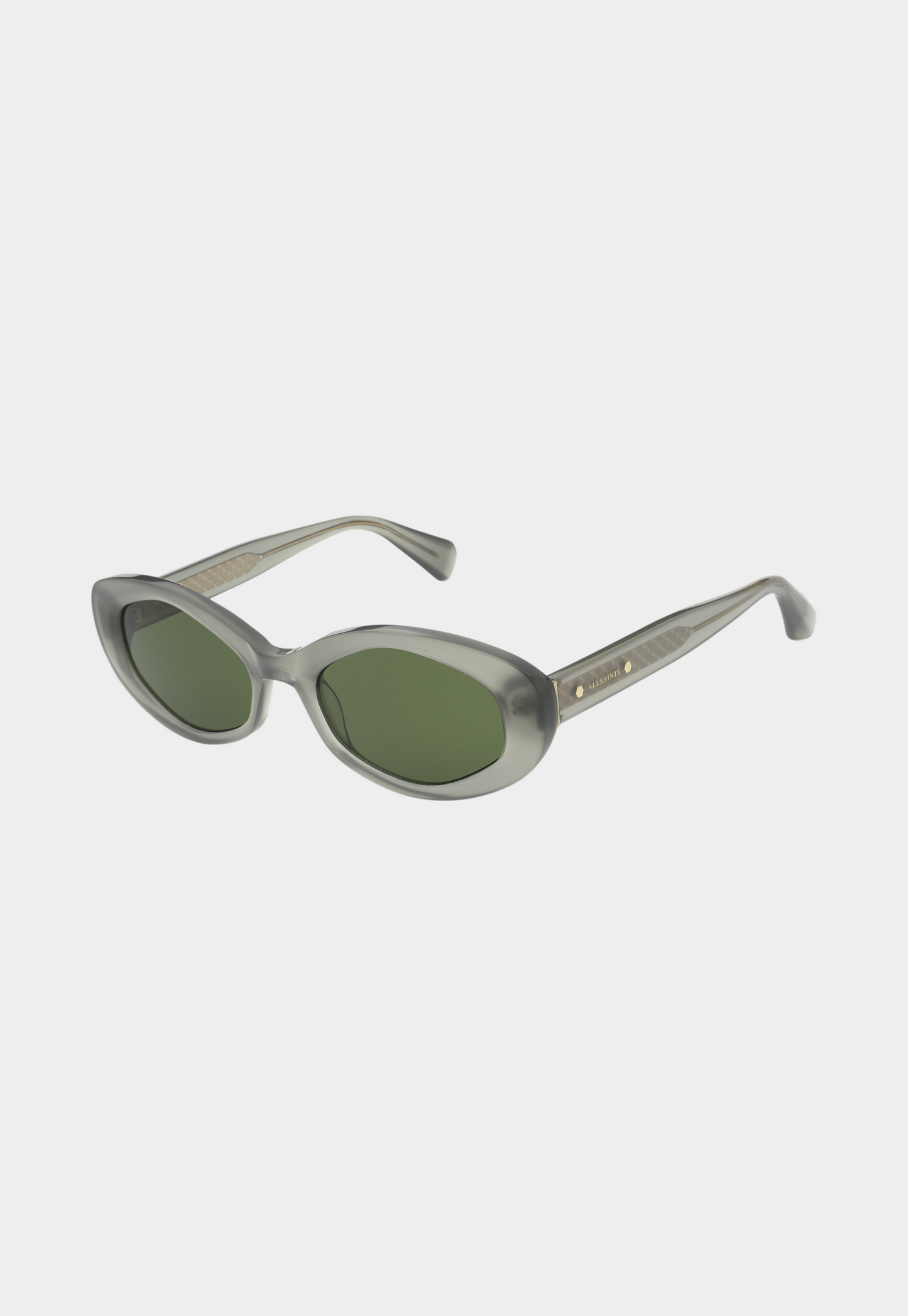 משקפי שמש לנשים מבית המותג אולסיינטס עם מסגרת אובאלית בגוון אפור שקוף ועדשות ירוקות כהות.