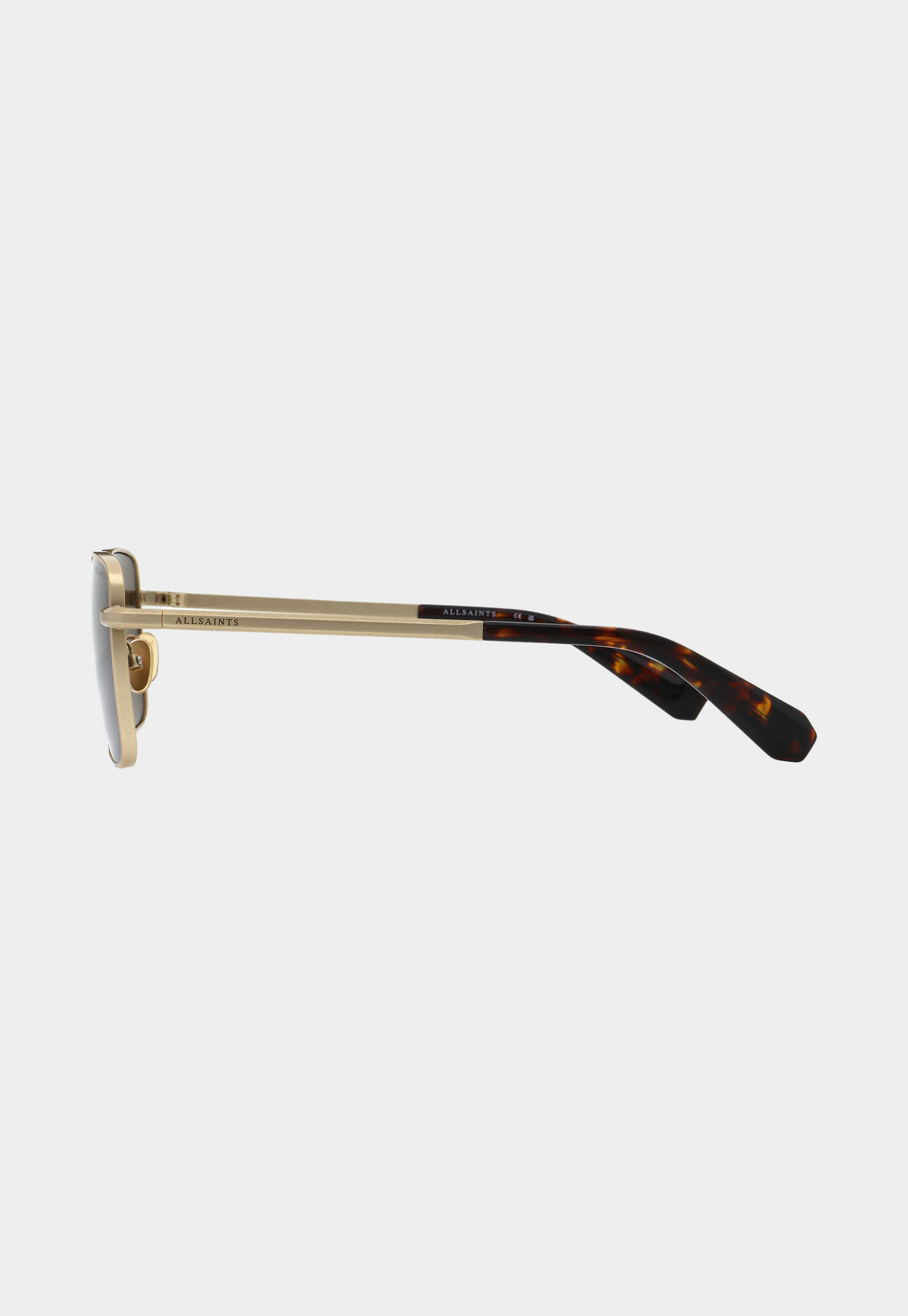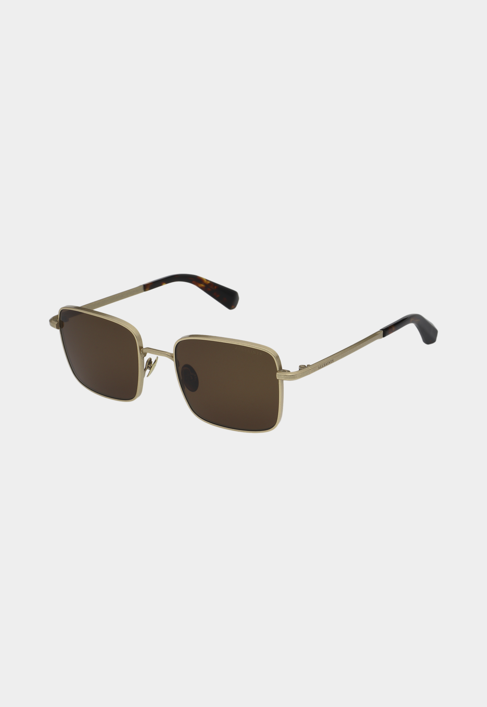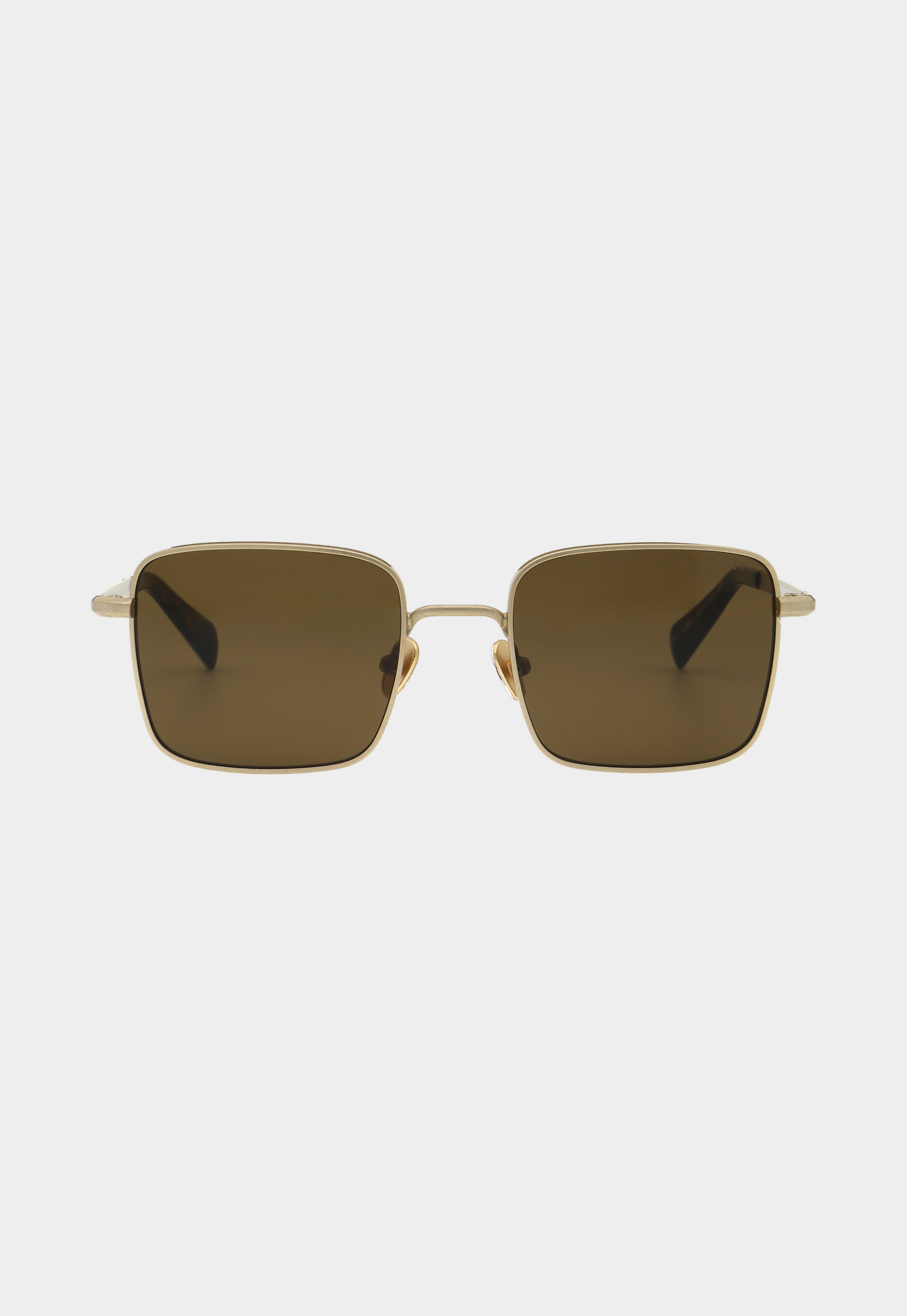 משקפי שמש לנשים וגברים מבית המותג אולסיינטס עם מסגרת מתכת דקה בגוון זהב ועדשות מרובעות חומות.