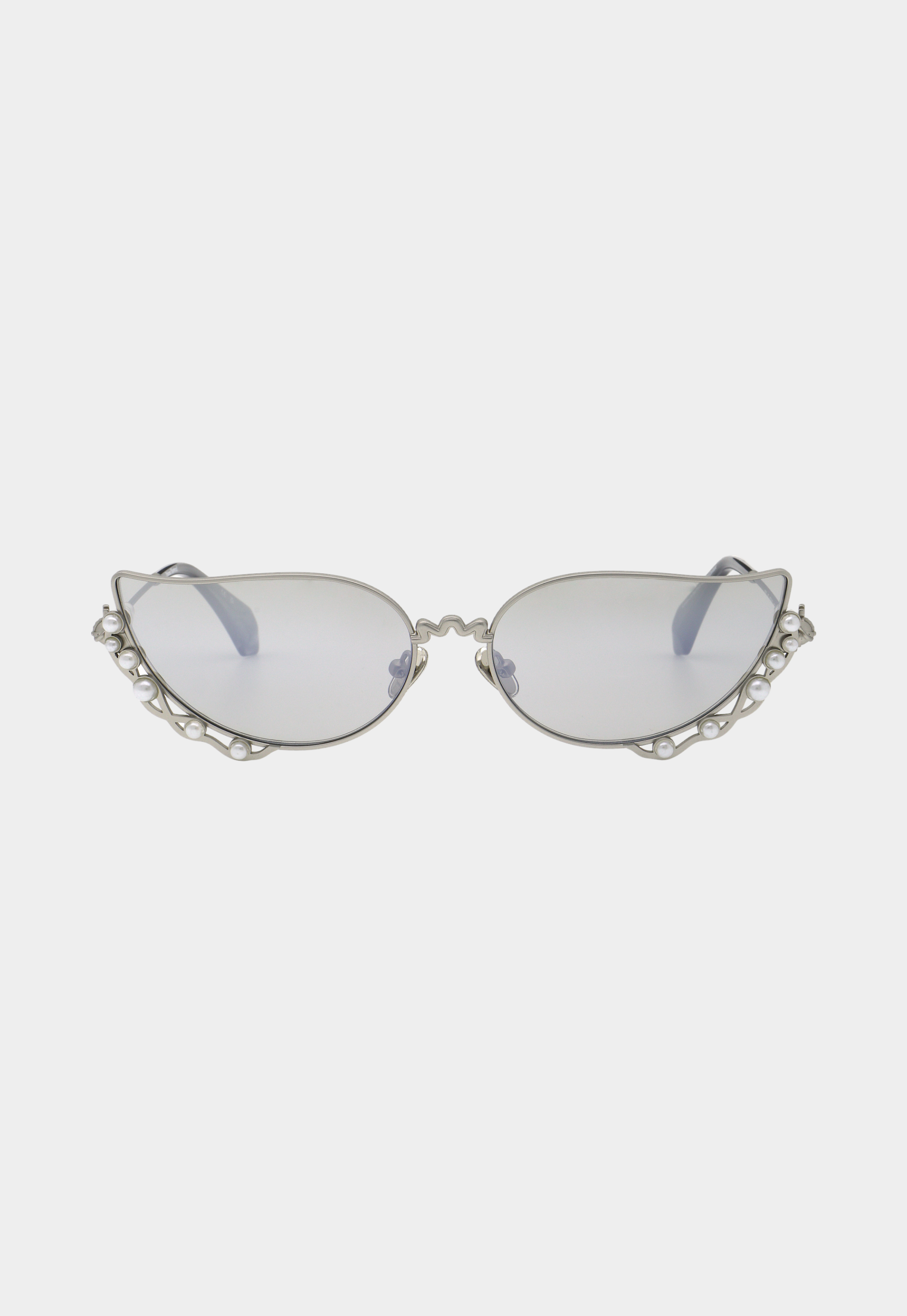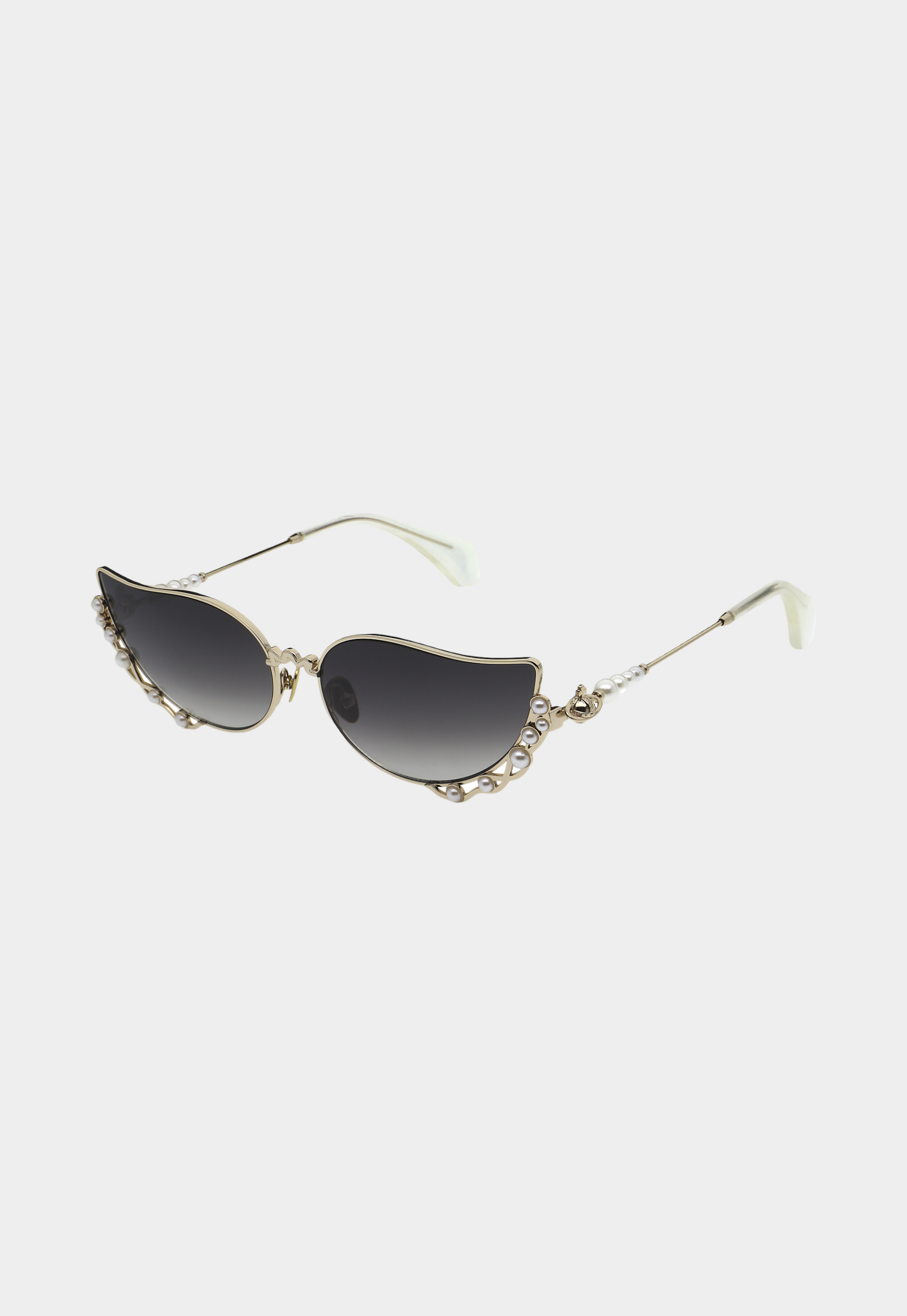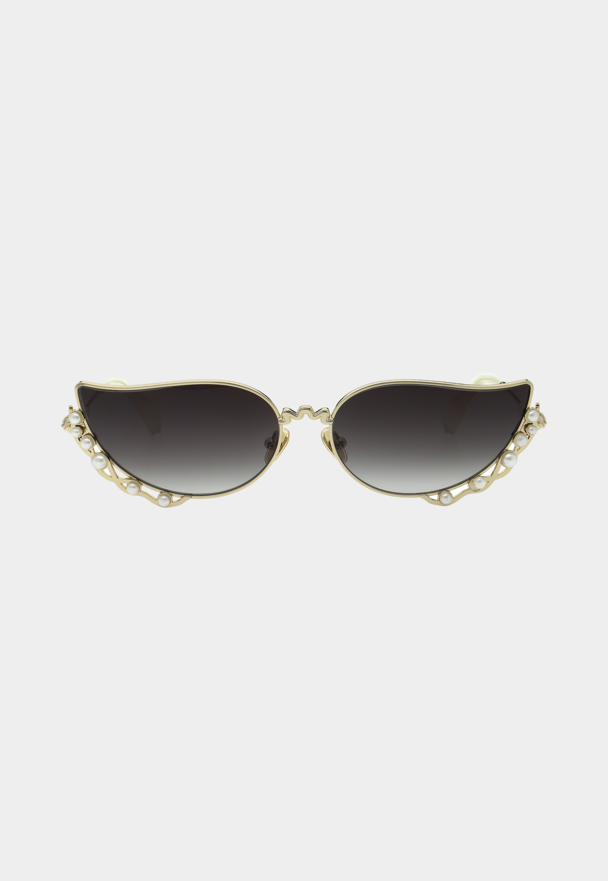 דגם ייחודי בעיצוב גלי עם מסגרת זהובה, שילוב פנינים ועדשות מדורגות כהות.