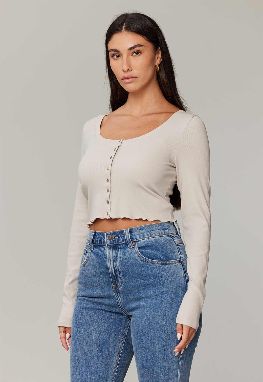 גזרת קרופ מבד ריב, עם כפתורים לכל אורכה כך שניתן לשחק עם הגזרה שלה פתוח או סגור או אפילו רק כפתור בודד.