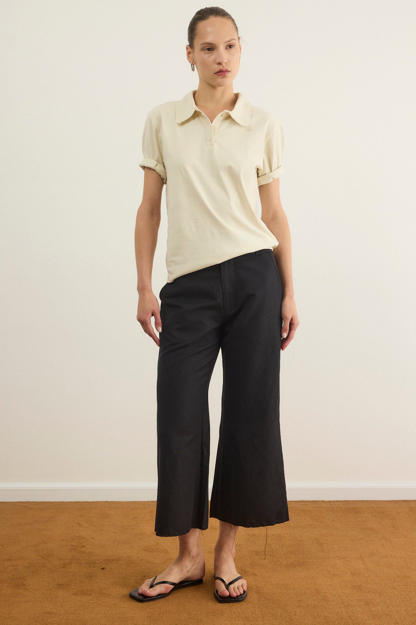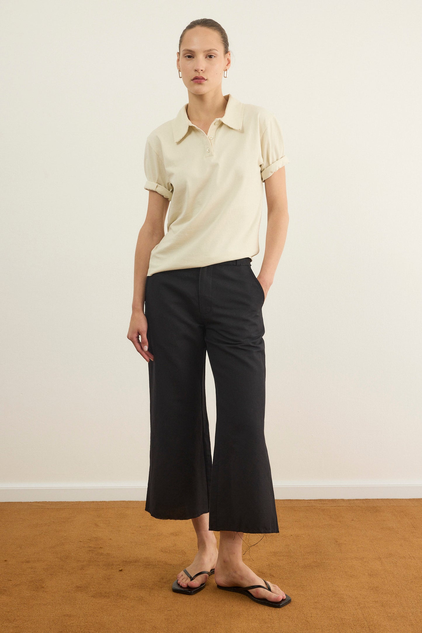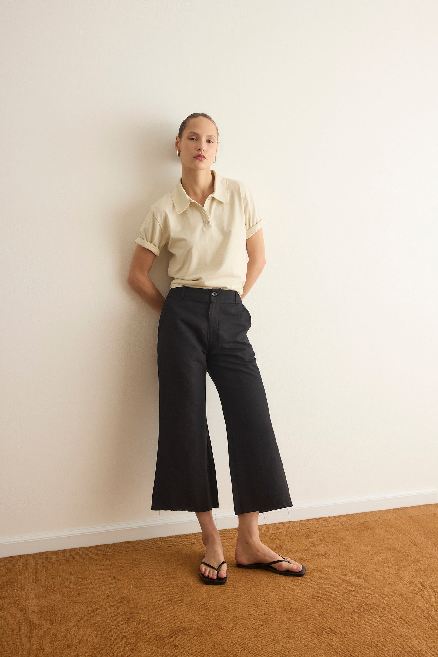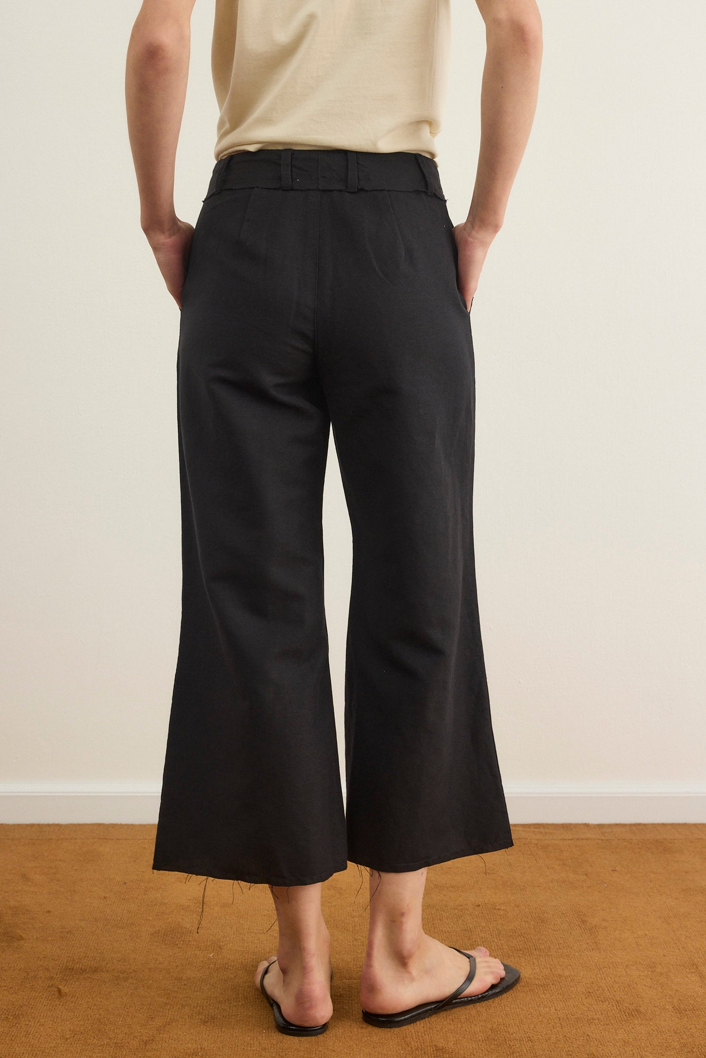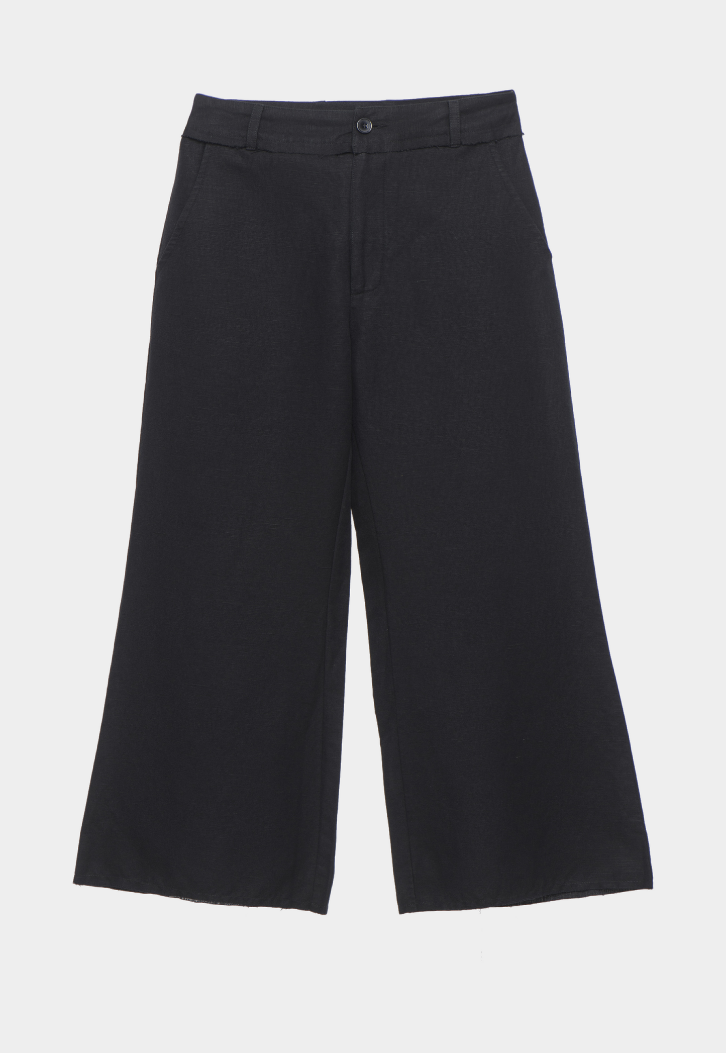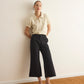 מכנסי קפרי באורך 7/8 בגזרה מתרחבת ודיטיילס פרימות בסיומת ,עשוי מבד פשתן נעים וקייצי.