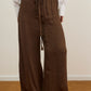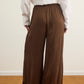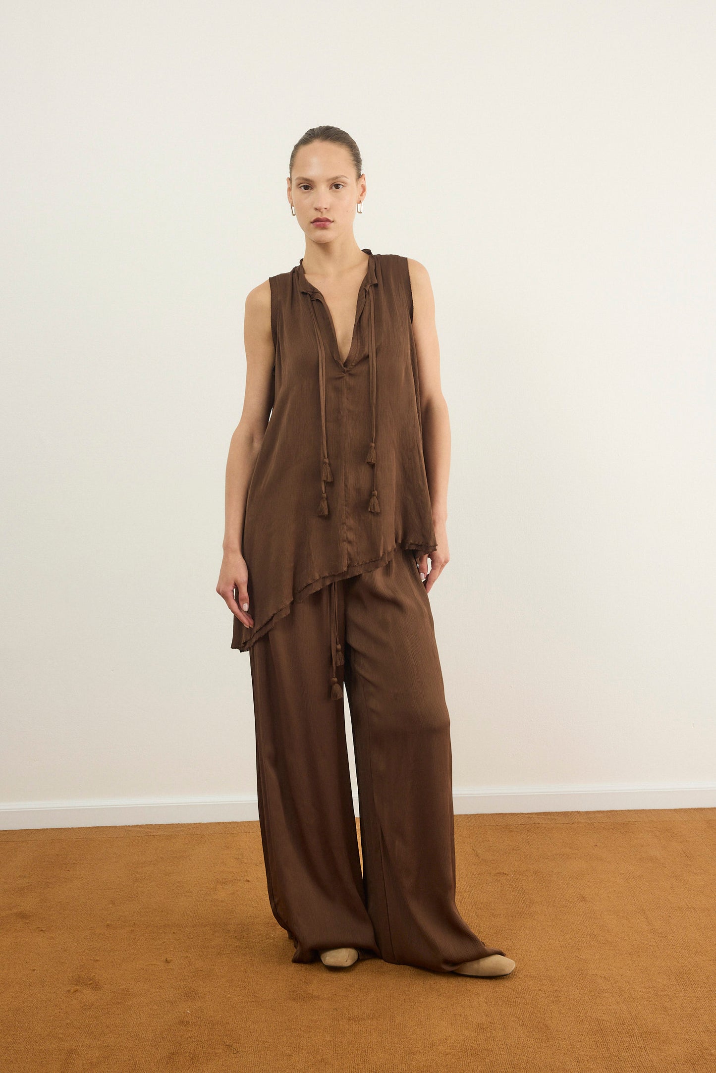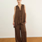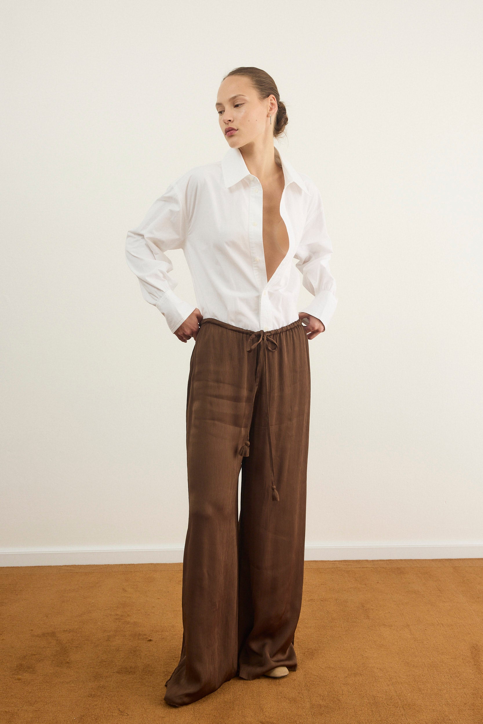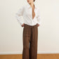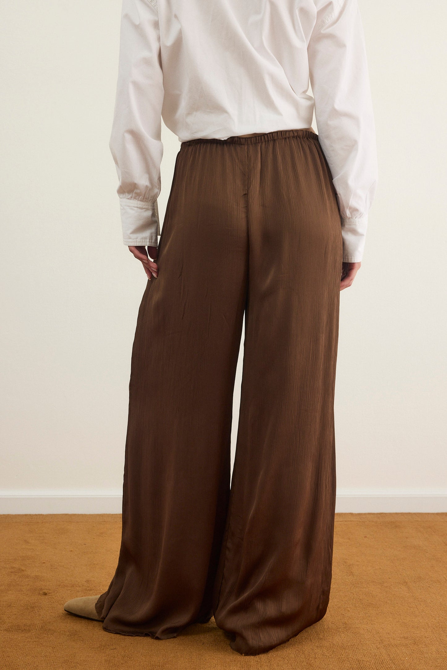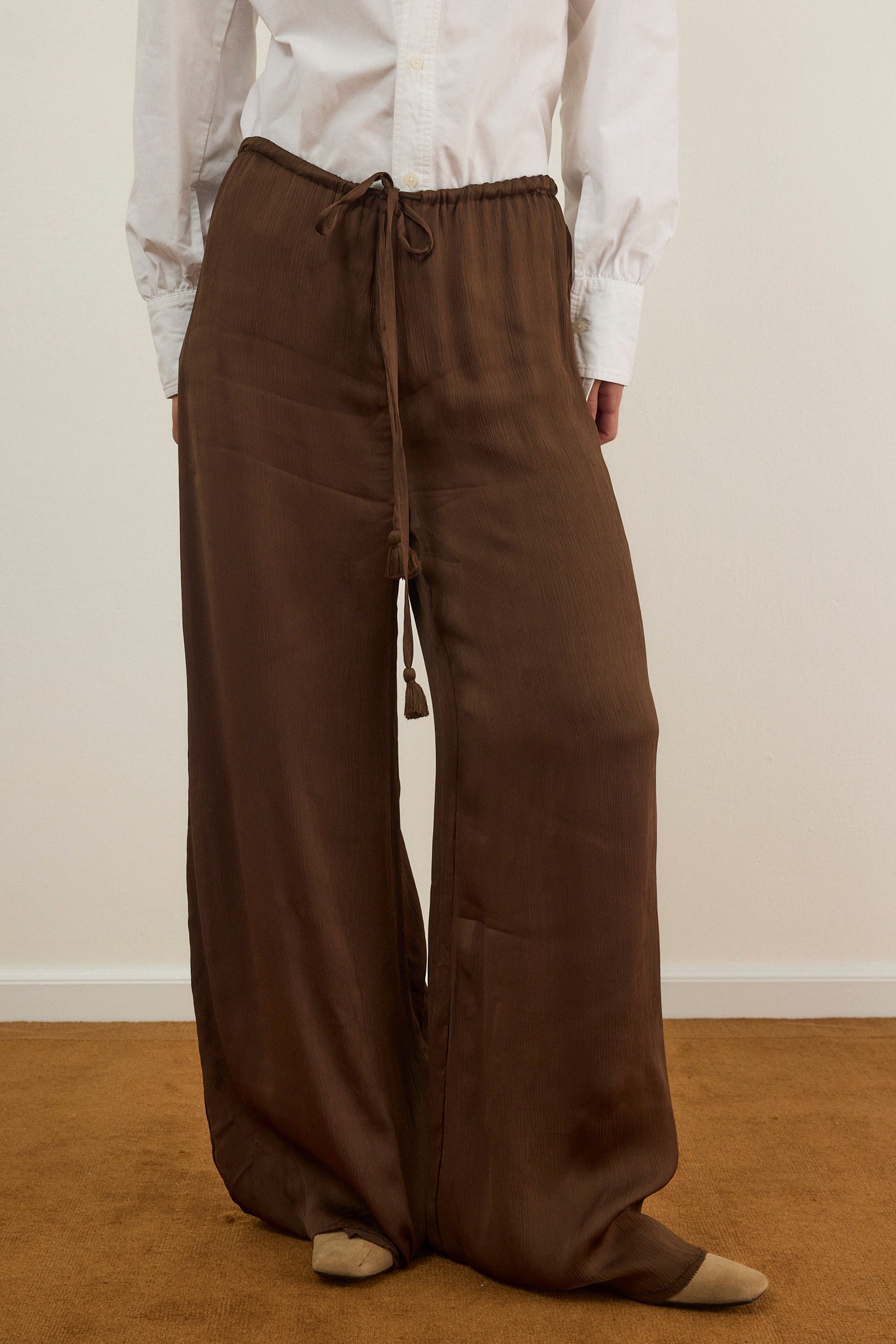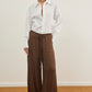 מכנסיים אלגנטיים עם גומי קשירה במותן בגזרה מחמיאה ומשוחררת עשוי שתי שכבות שיפון פליסה בגימור סטן אלגנטי.