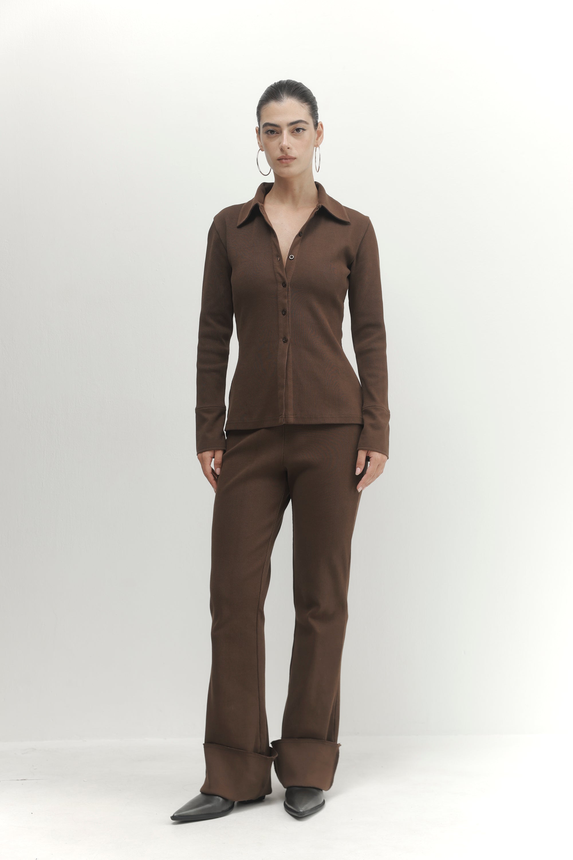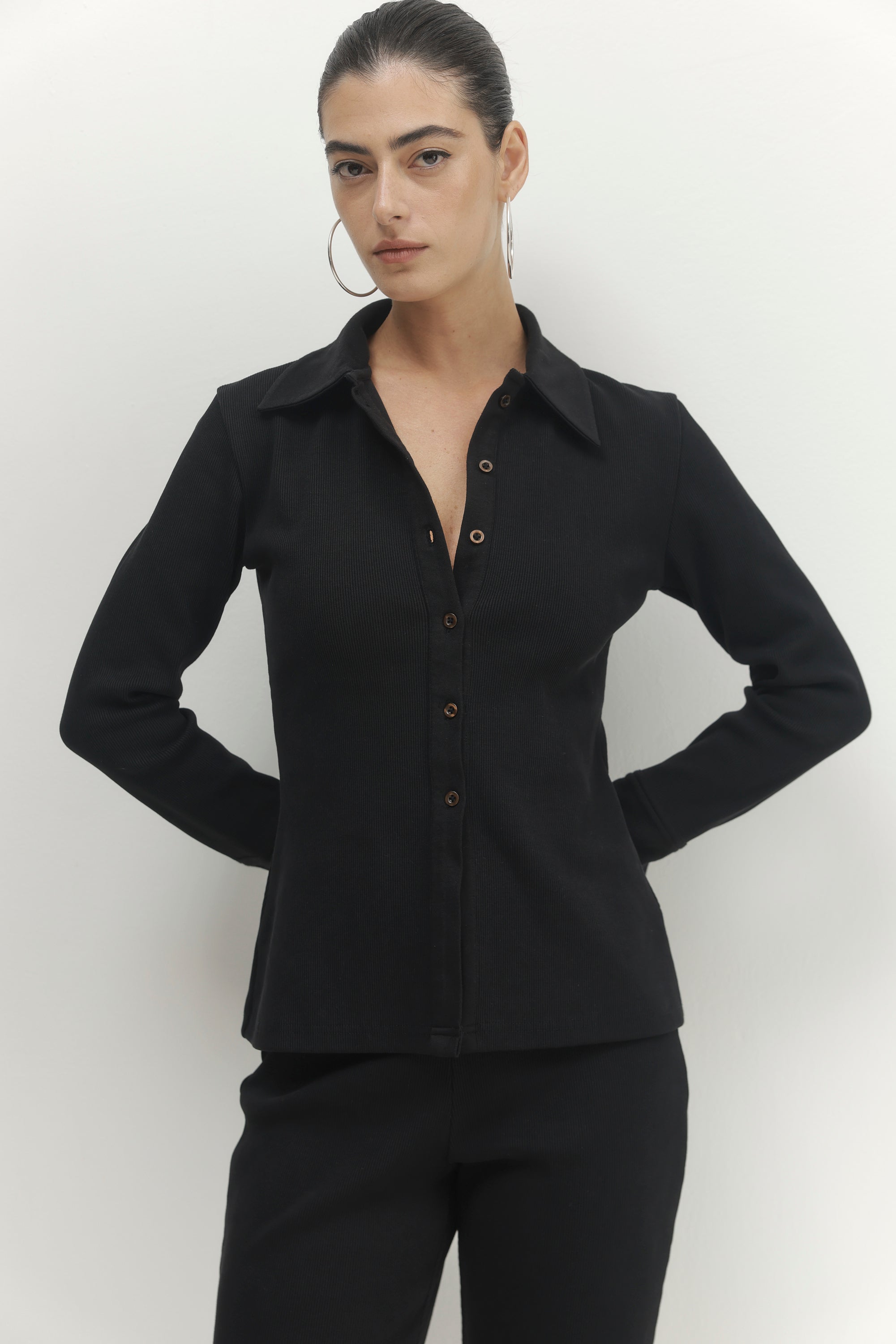 חולצה מכופתרת מבד ריב עבה ואיכותי, עם שרוולים ארוכים ודיטייל אלגנטי בחפתים- מומלץ לשלב עם המכנסיים התואמים.