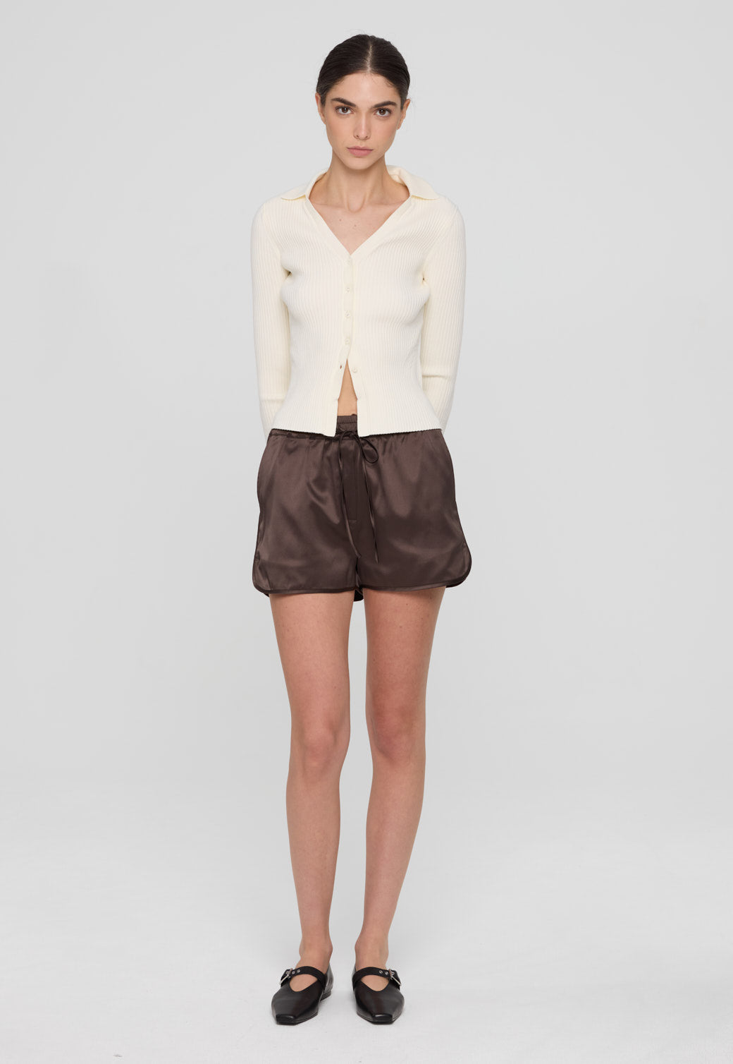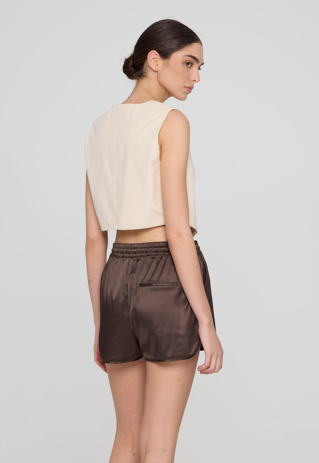 מכנסי סאטן קצרים לנשים מבית המותג פייפר. בגזרה משוחררת עם גומי וקשירה במותן, שני כיסים קדמיים ושסע קטן בצדדים. מעוצבים מבד סאטן מבריק.