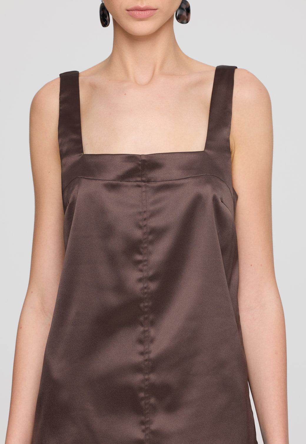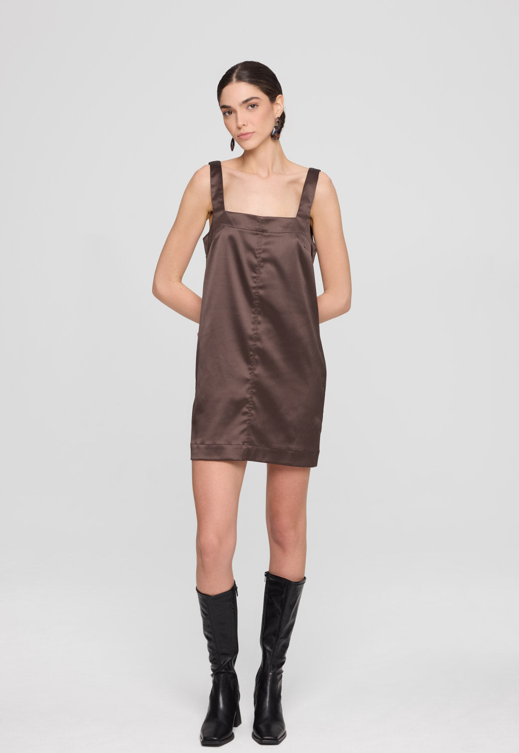 שמלת מיני לנשים מבית המותג פייפר. במפתח מרובע עם כתפיות רחבות, בגזרת A משוחררת. מעוצבת מבד סאטן בגימור מבריק.