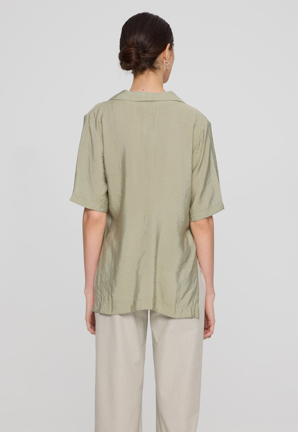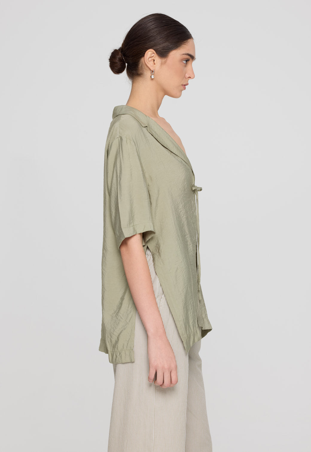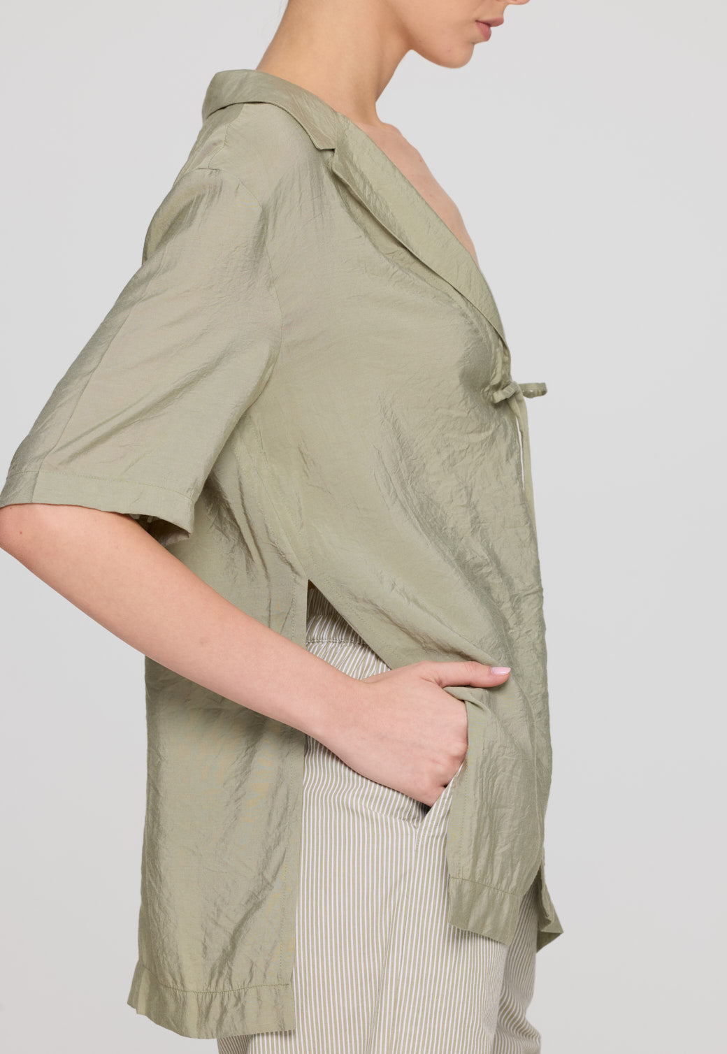 חולצה קצרה לנשים מבית המותג פייפר. בגזרה משוחררת עם קשירה בחזית, שרוולים קצרים וצווארון קלאסי. מבד מעט שקפקף.