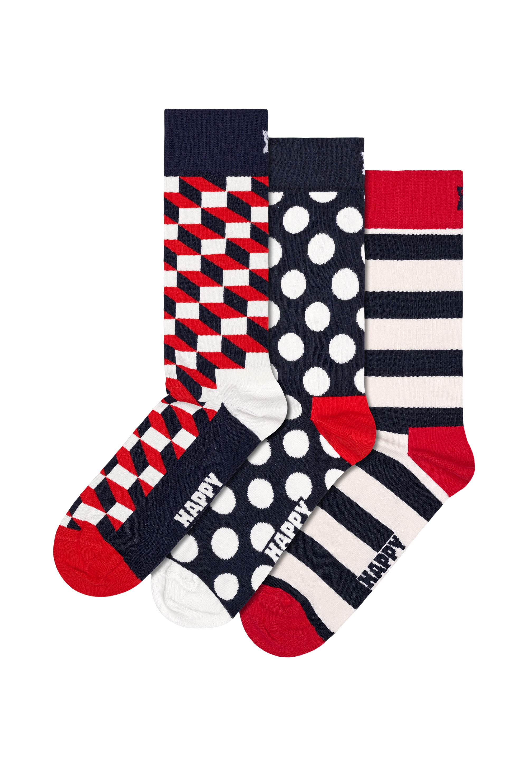 מארז 3 זוגות גרביים גבוהות מבית המותג האפי סוקס. בשילובי הדפסים שונים בצבעי אדום שחור.